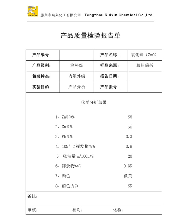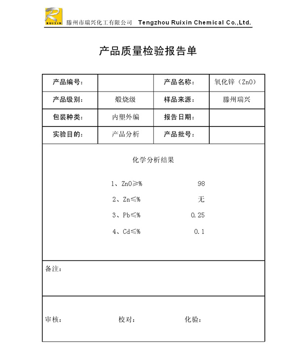 瑞興化工有限公司是生產(chǎn)氧化鋅的重點企業(yè),于2008年通過ISO9001:2008質(zhì)量管理體系認證。“瑞興”牌氧化鋅在國內(nèi)擁有較大穩(wěn)定的市場,并遠銷東南亞、中東、中南美等國家和地區(qū),在國內(nèi)外享有較高聲譽。
